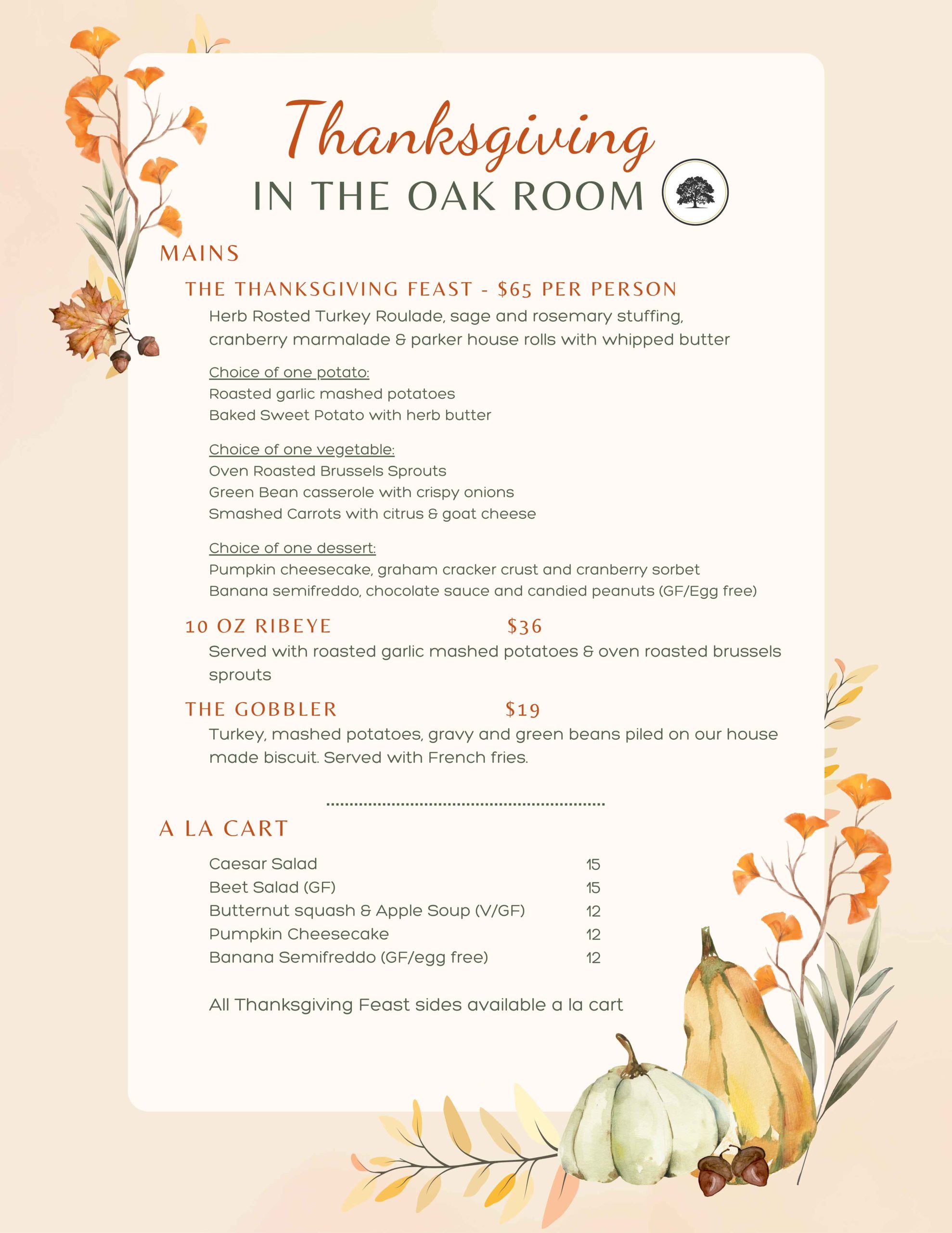Spend your Thanksgiving with us at Oak Room—let us handle the feast while you enjoy the holiday with your loved ones!